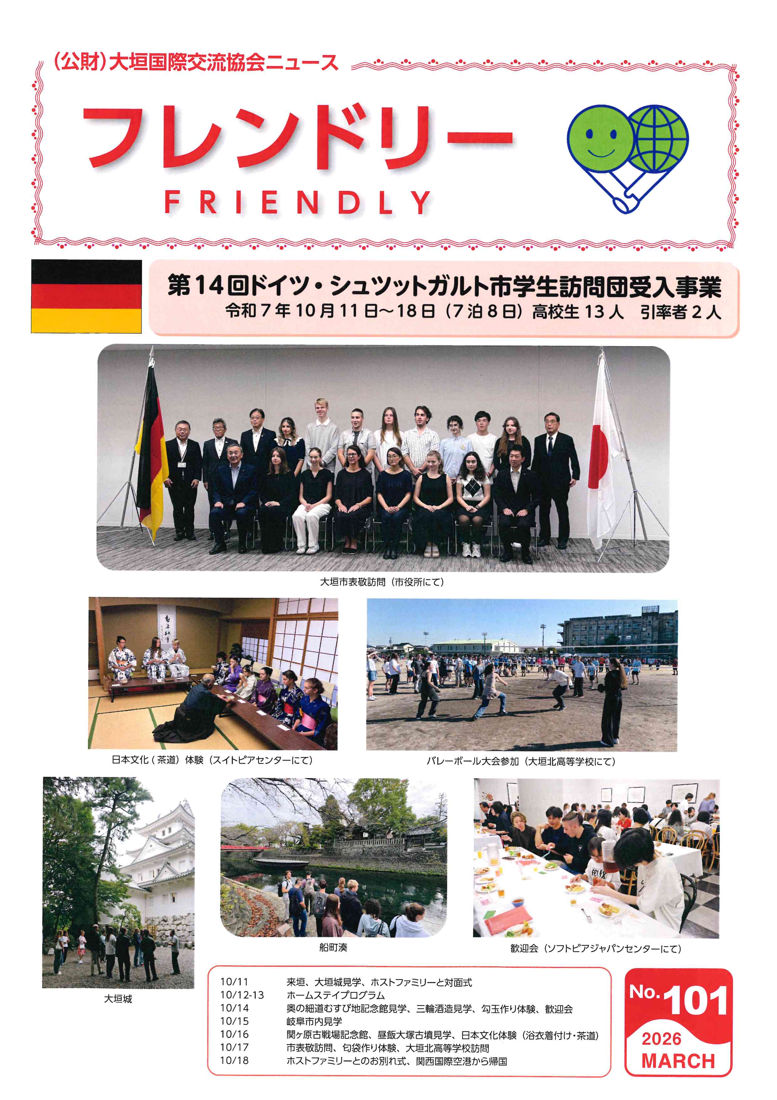 機関誌「フレンドリー」は101号を迎えました。表紙にドイツ学生訪問団受入事業を載せました。また、2つの派遣事業と2月に開催した「国際理解ワークショップ〜ペルー編〜」の模様をお伝えする記事も掲載しましたので、ぜひご覧ください。